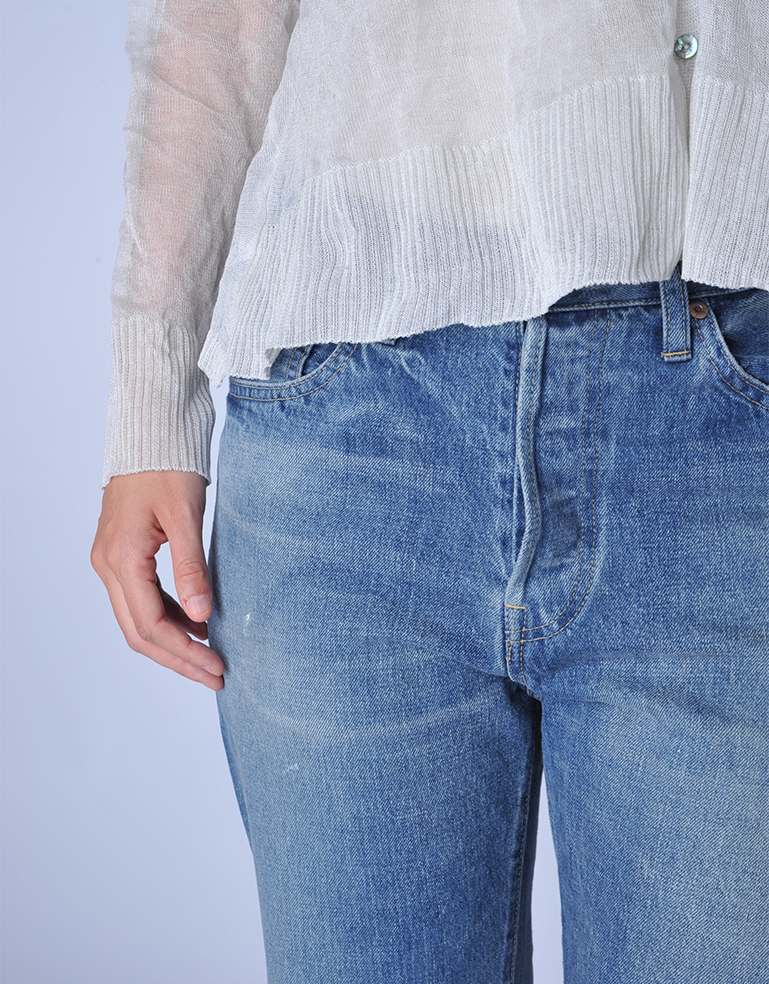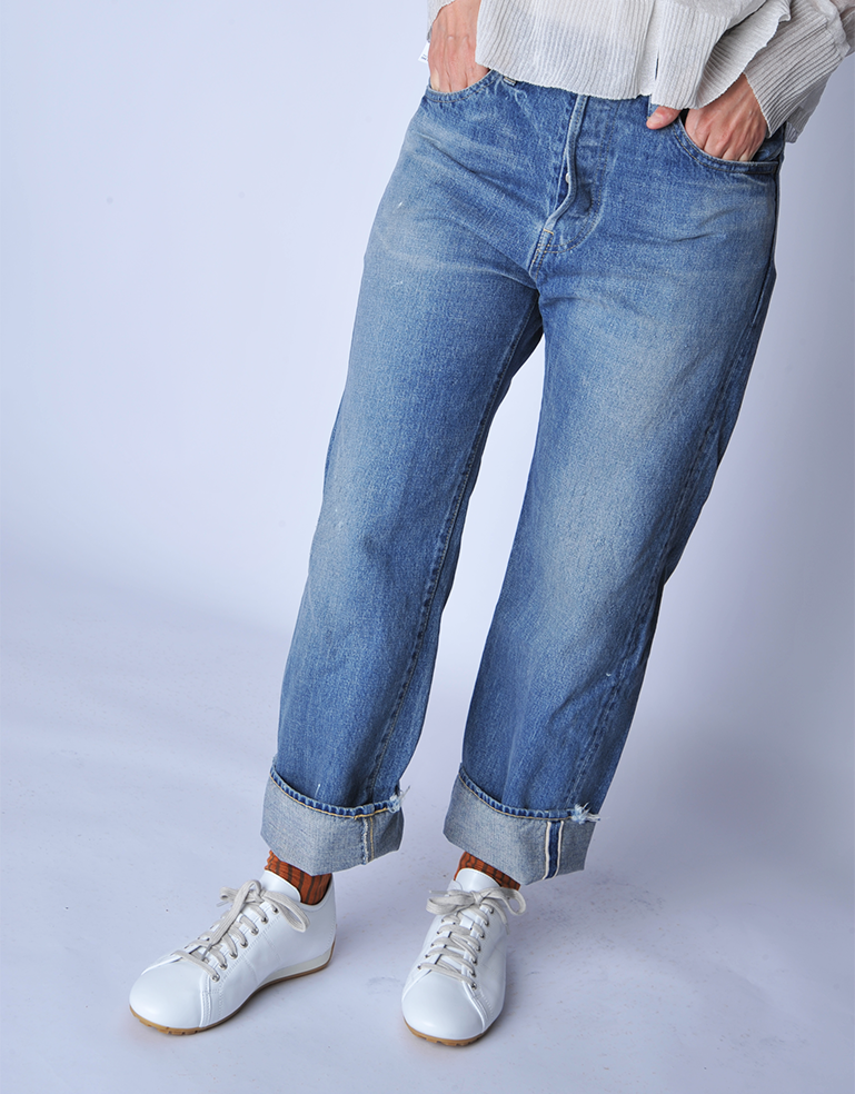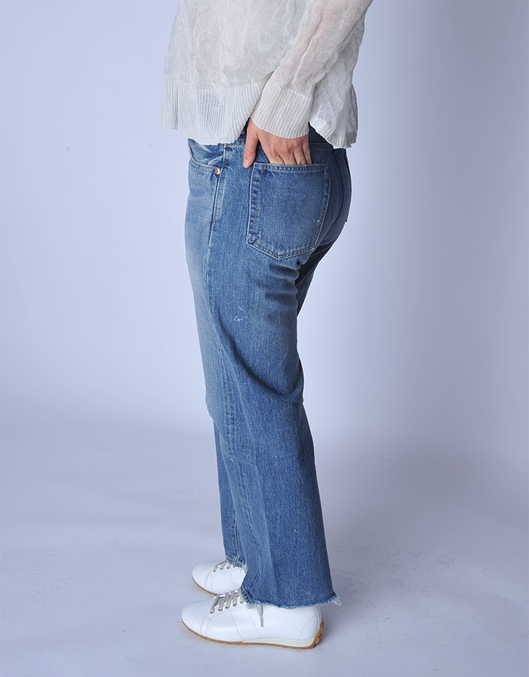 Meticulously handmade in Japan using exceptional quality denim. Made to order in very small quantities 2x a year. Head designer Noriko Machida's special touches show up throughout each piece via unique vintage inspired washes and fit. The Ankle Cut jean is made in a vintage wash and is a mid weight denim with a mid rise, straight waist and button fly.