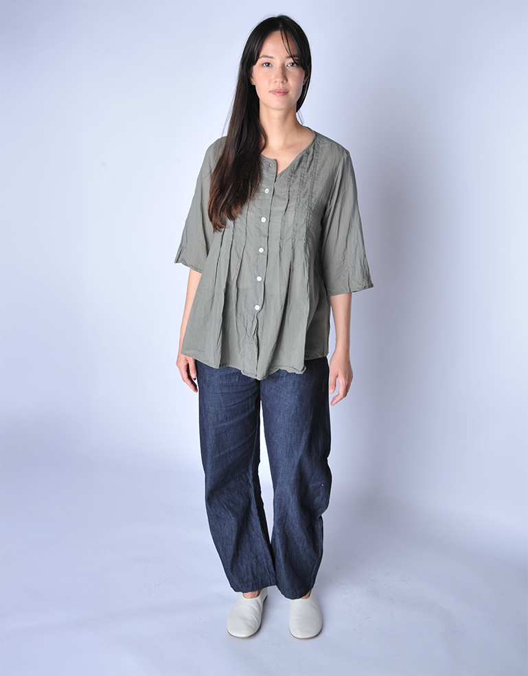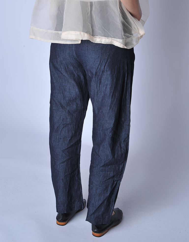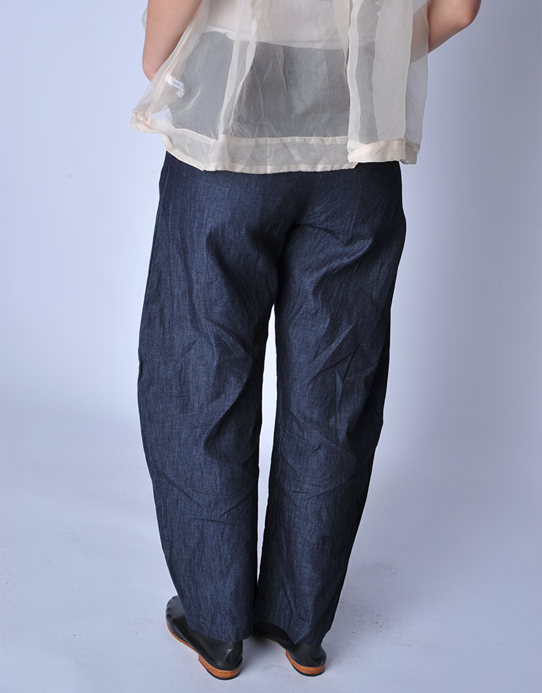 This easy fit high waist trouser features a slight barrel leg, button and fly front with elastic waist and side slash pockets. 2 back pockets.
