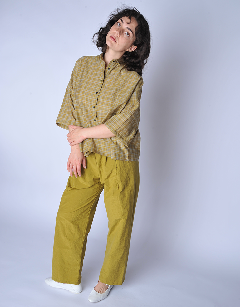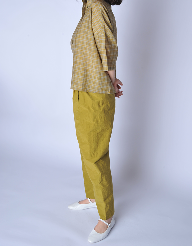 This easy olive cotton blend pant features an elastic waist, 4 front pleats, front angled pockets, clean back and relaxed fit. Classic length.