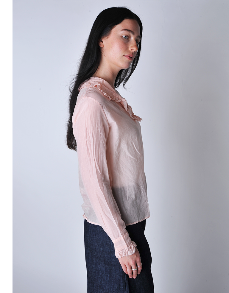 The super lovely Frill blouse features a V Neck with ruffles at the neck and the cuff. Long sleeves with 2 buttons at the cuff. The fabric is a bit sheer and requires a layer underneath.