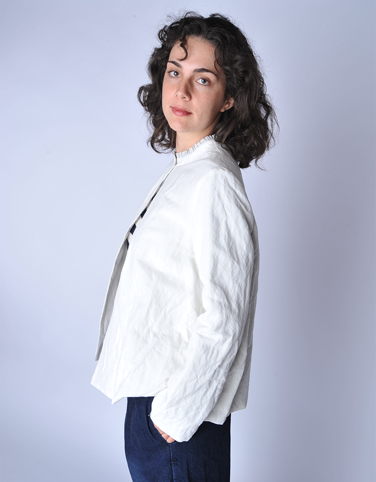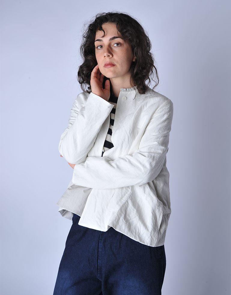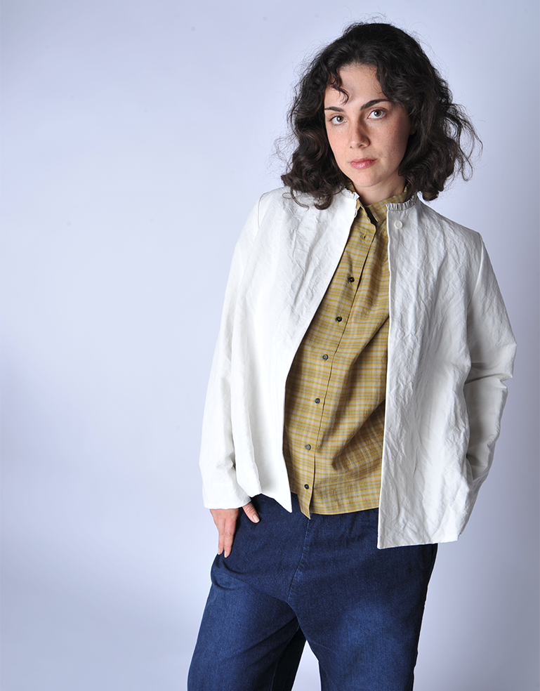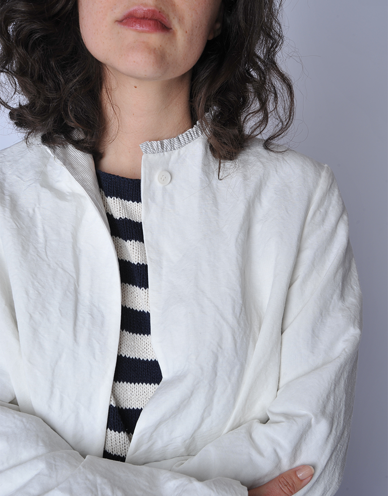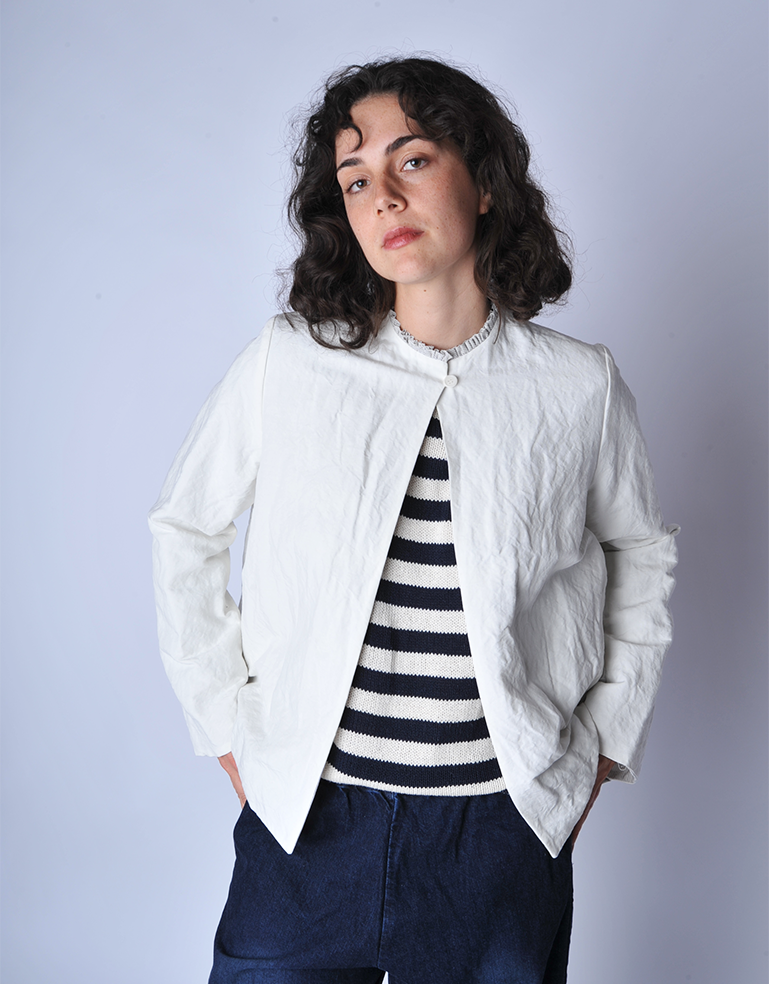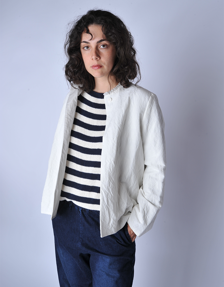 This lovely jacket is rendered in Italian linen and features a tiny striped ruffle collar, and a single button at the top. Side seam pockets and full striped lining. Model is five foot 9 and wearing size 1. Easy to dress up or down. Equally great with a pair of jean or a dressy skirt.