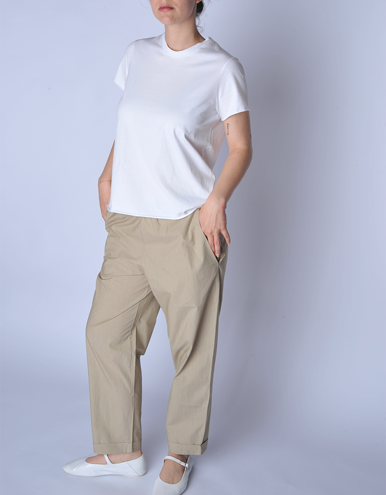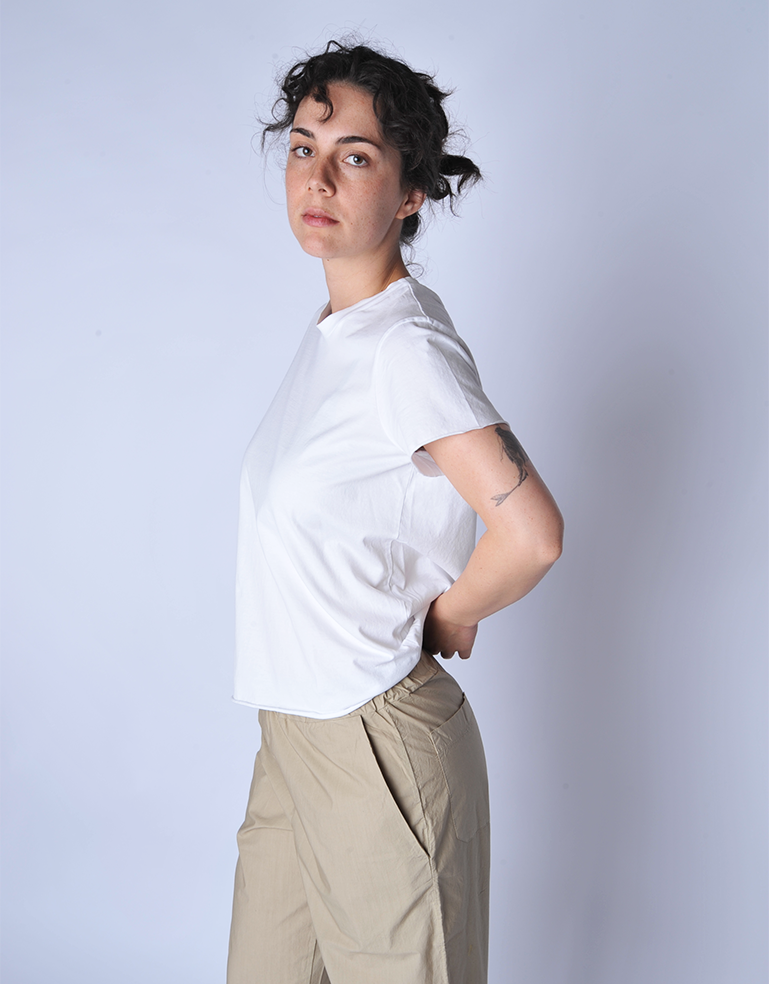 An easy elegant staple - quintessential Labo Art. Model is five foot 9 size 6 and wearing a size 1. Features a round neck, short rolled edge sleeve and easy fit.