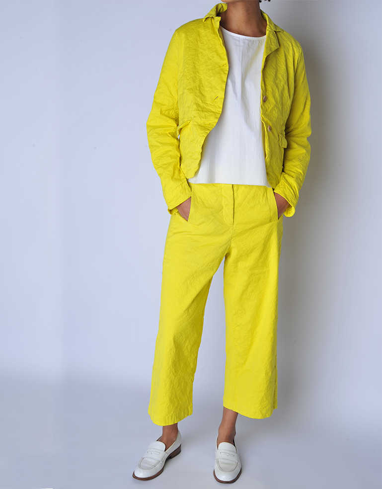 The Paulette Pant is an easy fit, super flattering cropped trouser featuring button and zip fly, flat front, elastic back, cropped length and angled front pockets.