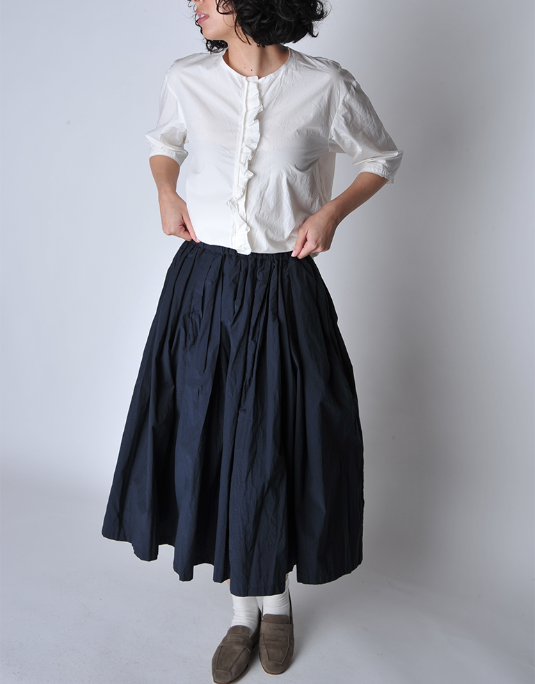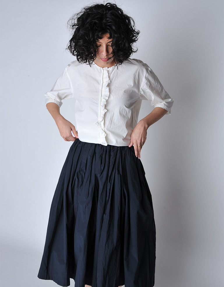 The Babe Skirt is a classic Manuelle Guibal style made in a newly developed fabric which is perfect for travel - this cotton and polyester blend allows for easy packing and quick wash and dry. The fabric has a bit of a bounce and responds beautifully to being squished into a ball and then moving onto your body. It feels like her classic cotton poplin but is a bit lighter in feel. The Babe Skirt is full with an elastic waist and side seam pockets. The color is a deep rich navy.