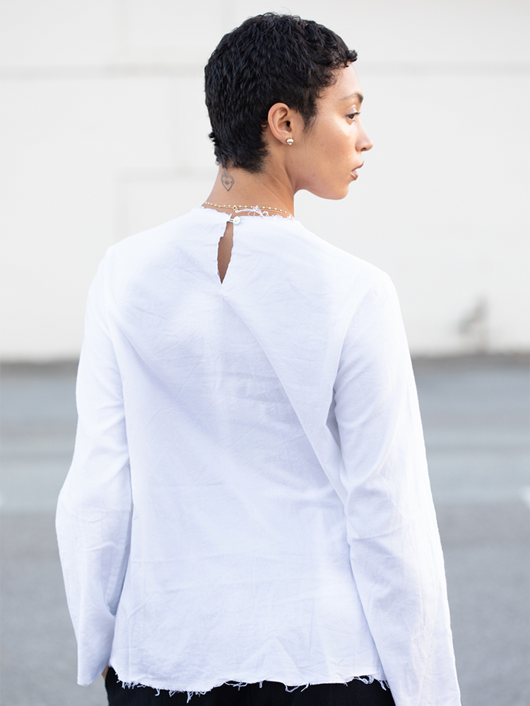 The Scha Flannel Long Sleeve features stitched, raw edges, round neck, and button at the nape of the neck. Easy slight A-line shape. The wrinkles and loose threads are intentional and part of the charm. (trim or let fly as you like)