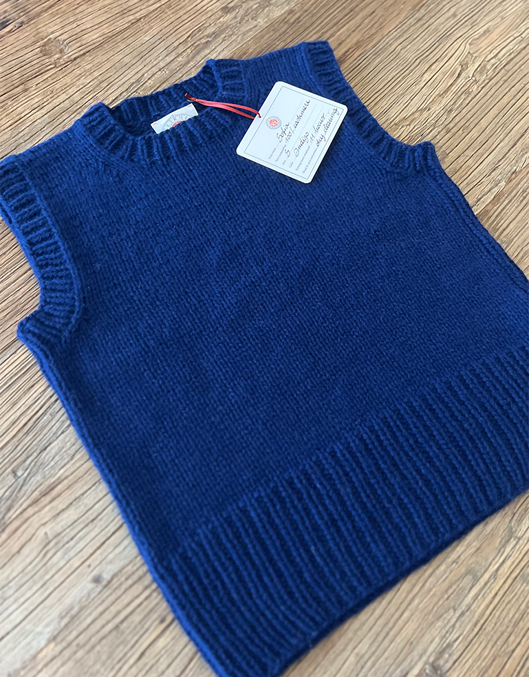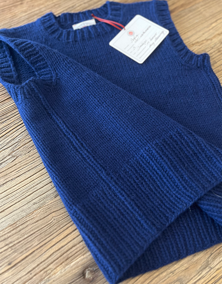 Indulge in luxury with 100% cashmere perfection. Crafted entirely by hand over 11 hours, the Sofia Cashmere Vest in Indigo by Miki Zanini is exclusive to Roztayger.
