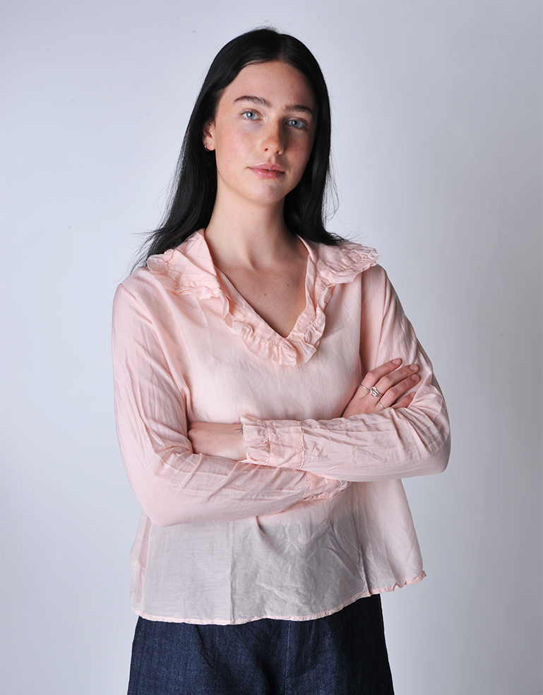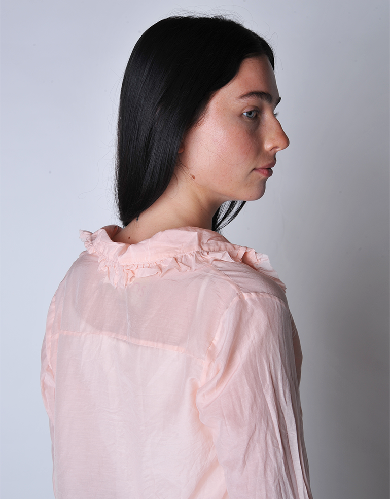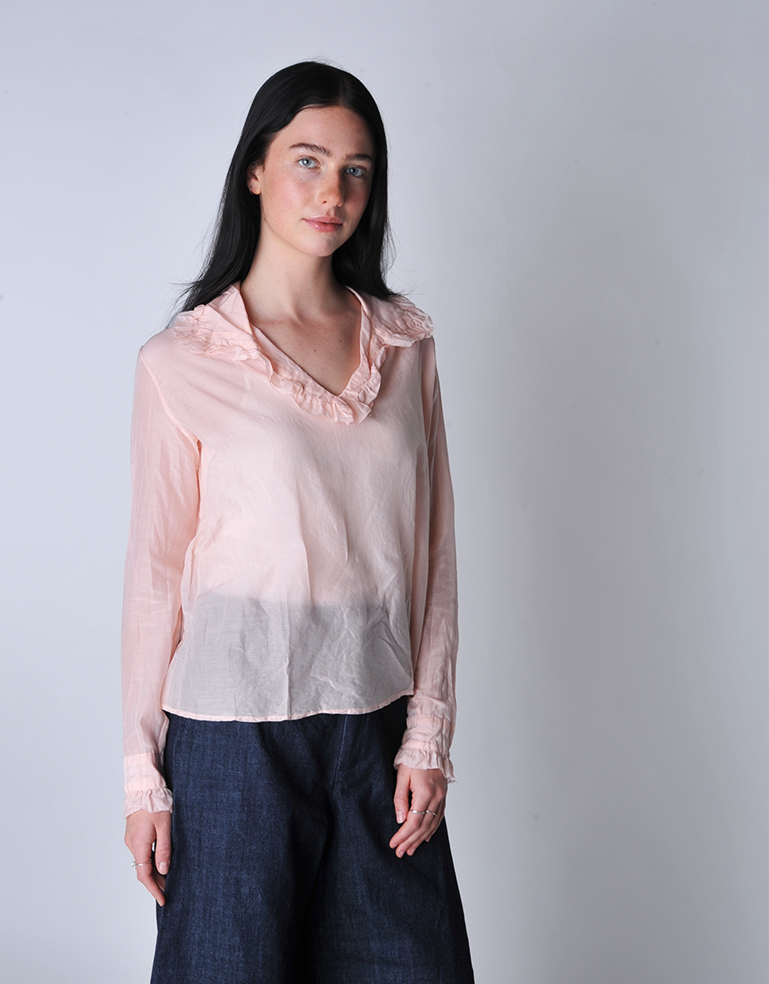 The super lovely Frill blouse features a V Neck with ruffles at the neck and the cuff. Long sleeves with 2 buttons at the cuff. The fabric is a bit sheer and requires a layer underneath.