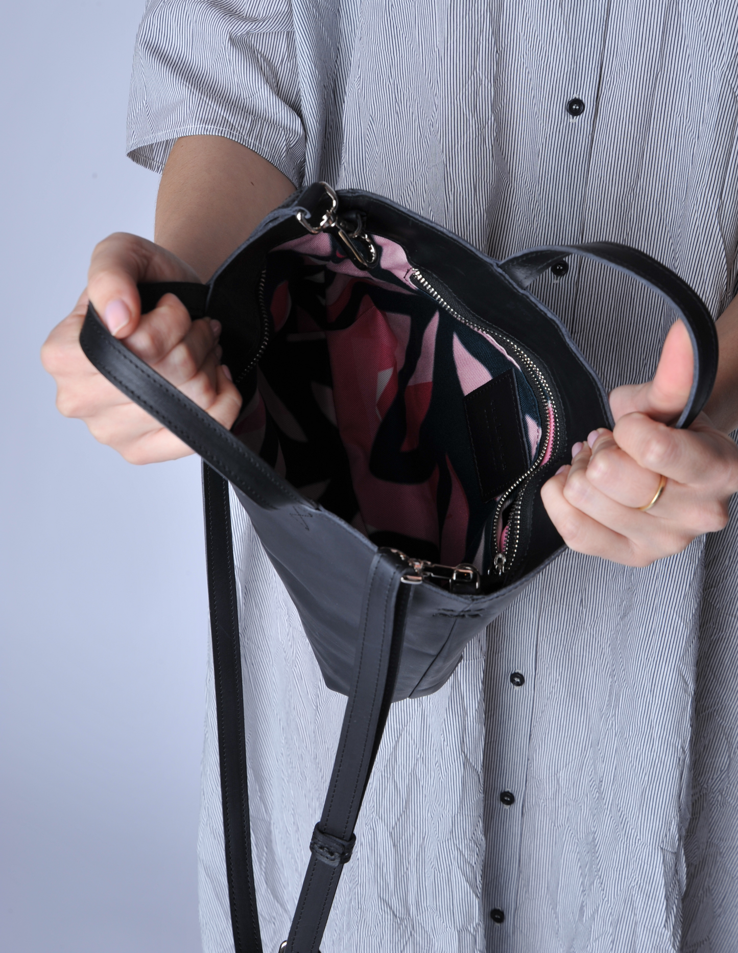 The Fio Bag features a full zip top, fabric lining with one interior zip pocket and both short handles and an adjustable removable leather strap (up to 42 inches). Made in a lovely supple lightweight leather.