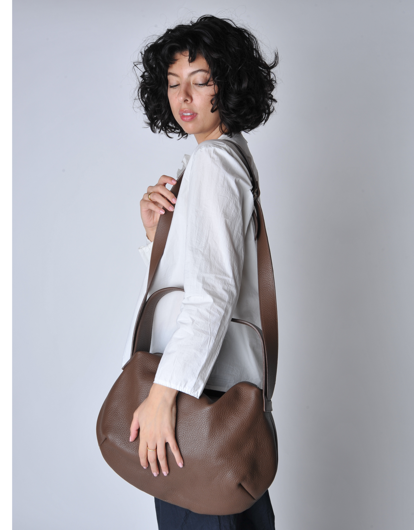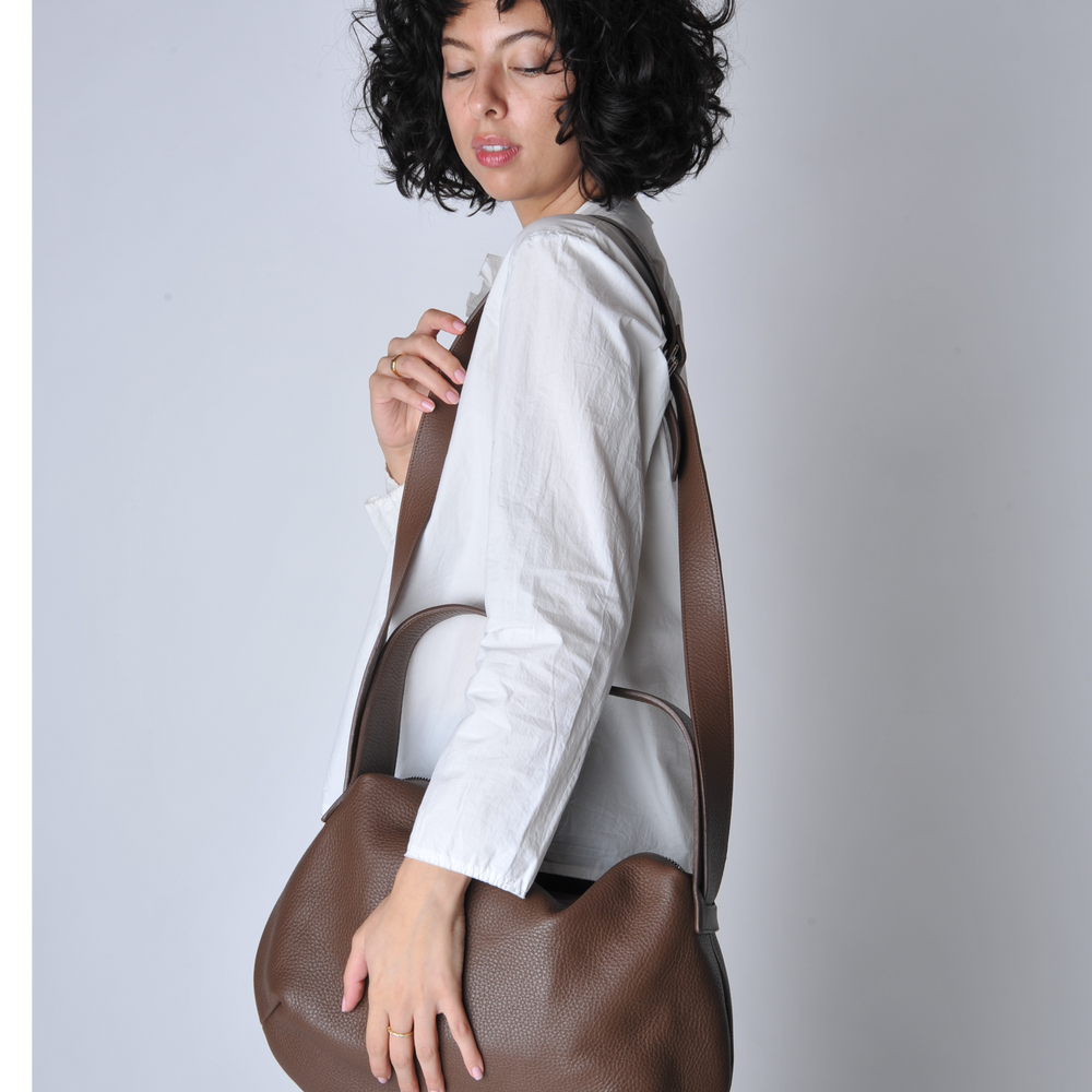 The Small Ace is a sumptuous, softly unstructured, minimal style slouch bag designed for people on-the-go. This style is made out of solid Portuguese natural grain leather and embellished with sleek Italian hardware. Two straps, zipper close top, leather lining and one drop down pocket.